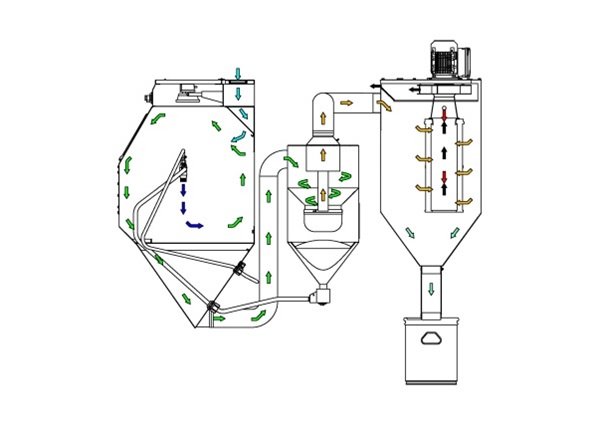 integrovaný systém recyklace tryskacího média v cyklonovém odlučovači s regulovatelnou separací prachu